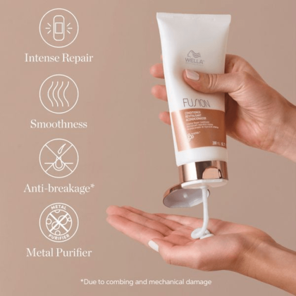 The next dimension in hair recovery: Achieve smoother, more resilient hair with Wella Professionals Fusion Intense Repair Conditioner. This professional conditioner especially indicated for damaged hair helps to protect hair against breakage due to combing and prevents future damage. Formulated with silk aminoacids, Wella Fusion Conditioner provides hair protection against mechanical damage and leaves hair more resilient against breakage. Professional conditioner for damaged hair, provides hair protection against mechanical damage and breakage due to combing. Wella Fusion hair conditioner with silk aminoacids, leaves hair smooth and more resilient.